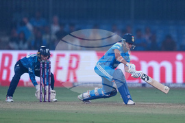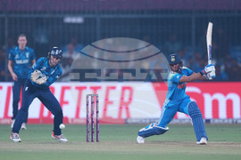 India's Deepti Sharma plays a shot during the ICC Women's Cricket World Cup match between India and England in Indore, India, Sunday, Oct. 19, 2025. (AP Photo/Ajit Solanki)