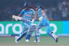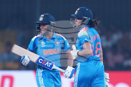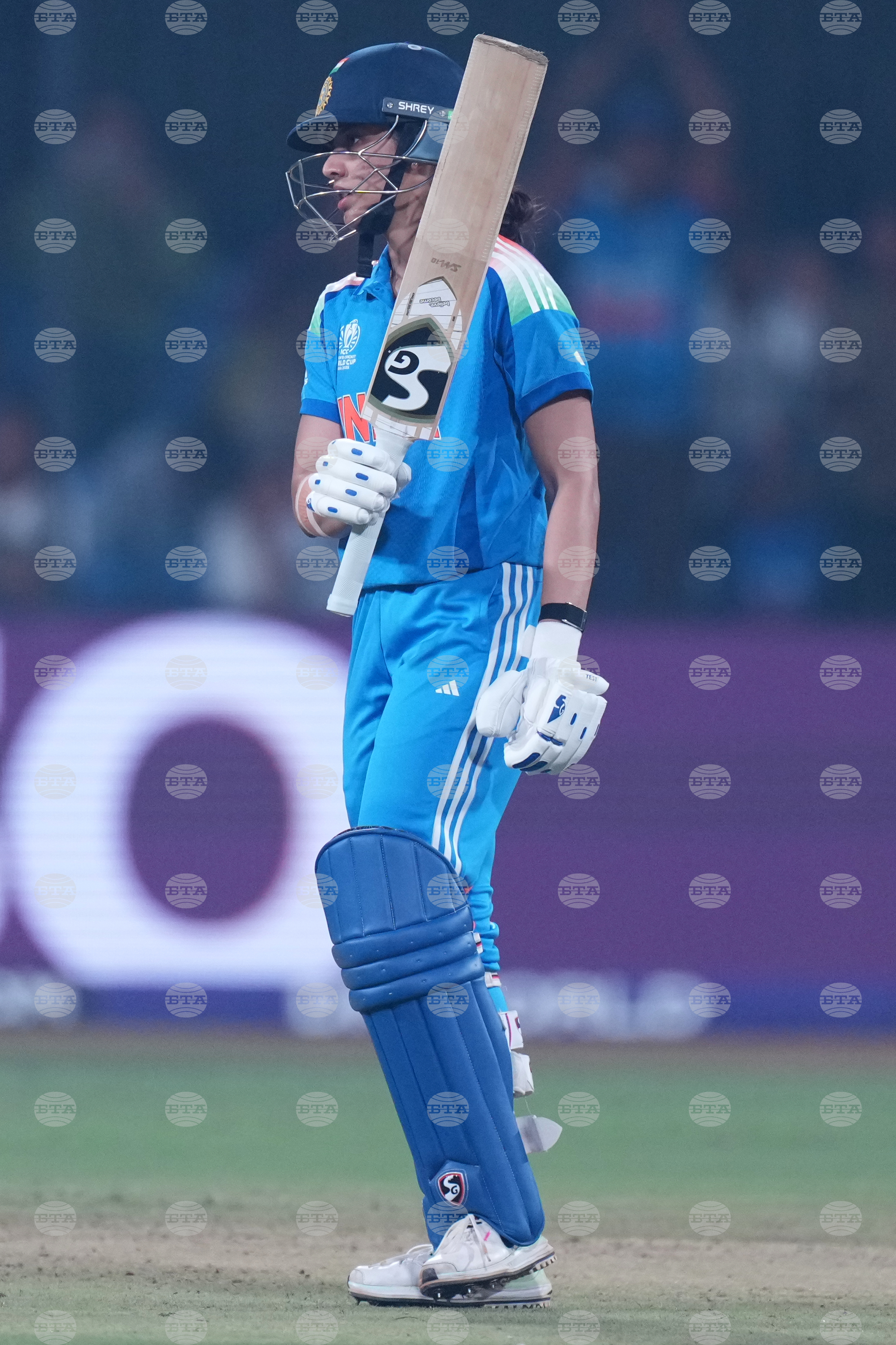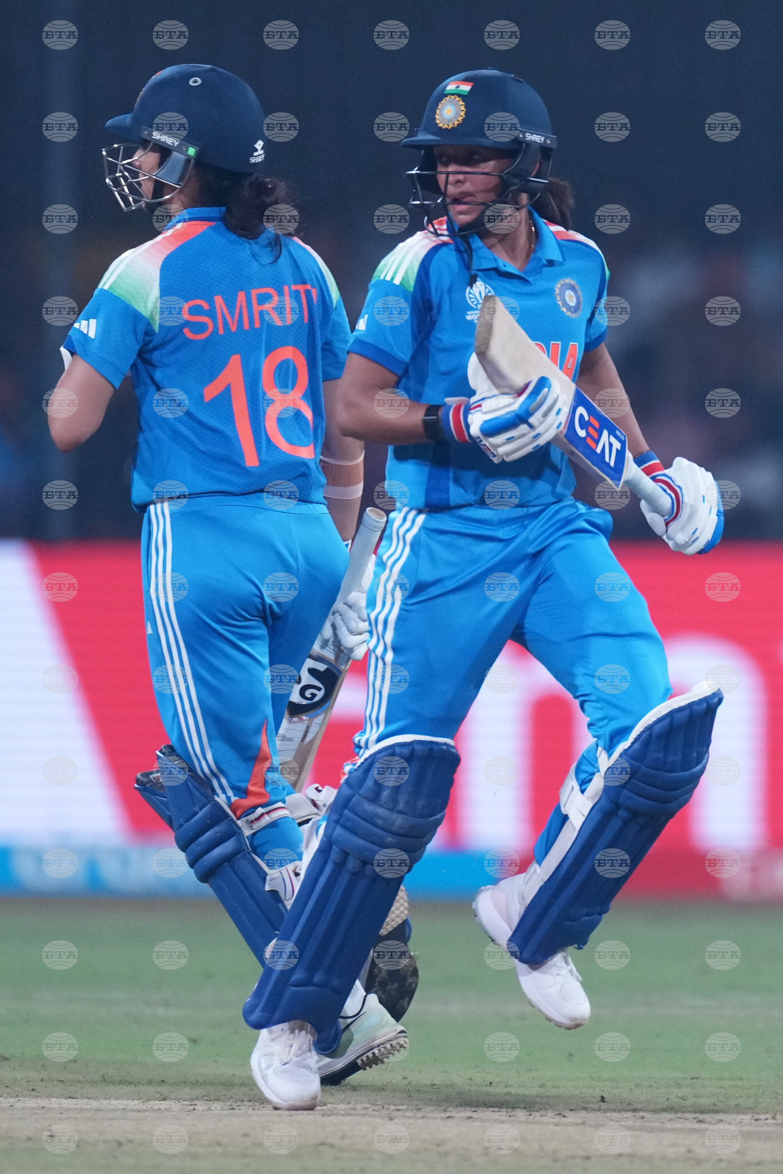 India's captain Harmanpreet Kaur, right, congratulated by Smriti Mandhana as she score fifty run during the ICC Women's Cricket World Cup match between India and England in Indore, India, Sunday, Oct. 19, 2025. (AP Photo/Ajit Solanki)