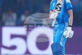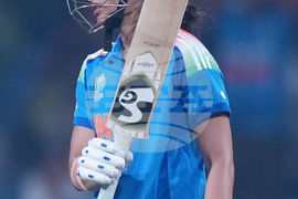 India's Smriti Mandhana celebrates her fifty runs during the ICC Women's Cricket World Cup match between India and England in Indore, India, Sunday, Oct. 19, 2025. (AP Photo/Ajit Solanki)