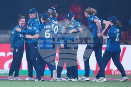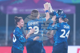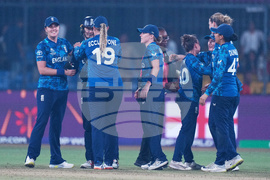 England's captain Nat Sciver-Brunt, center, celebrates with teammate the wicket of India's captain Harmanpreet Kaur during the ICC Women's Cricket World Cup match between India and England in Indore, India, Sunday, Oct. 19, 2025. (AP Photo/Ajit Solanki)