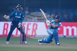 India's Smriti Mandhana plays a shot during the ICC Women's Cricket World Cup match between India and England in Indore, India, Sunday, Oct. 19, 2025. (AP Photo/Ajit Solanki)