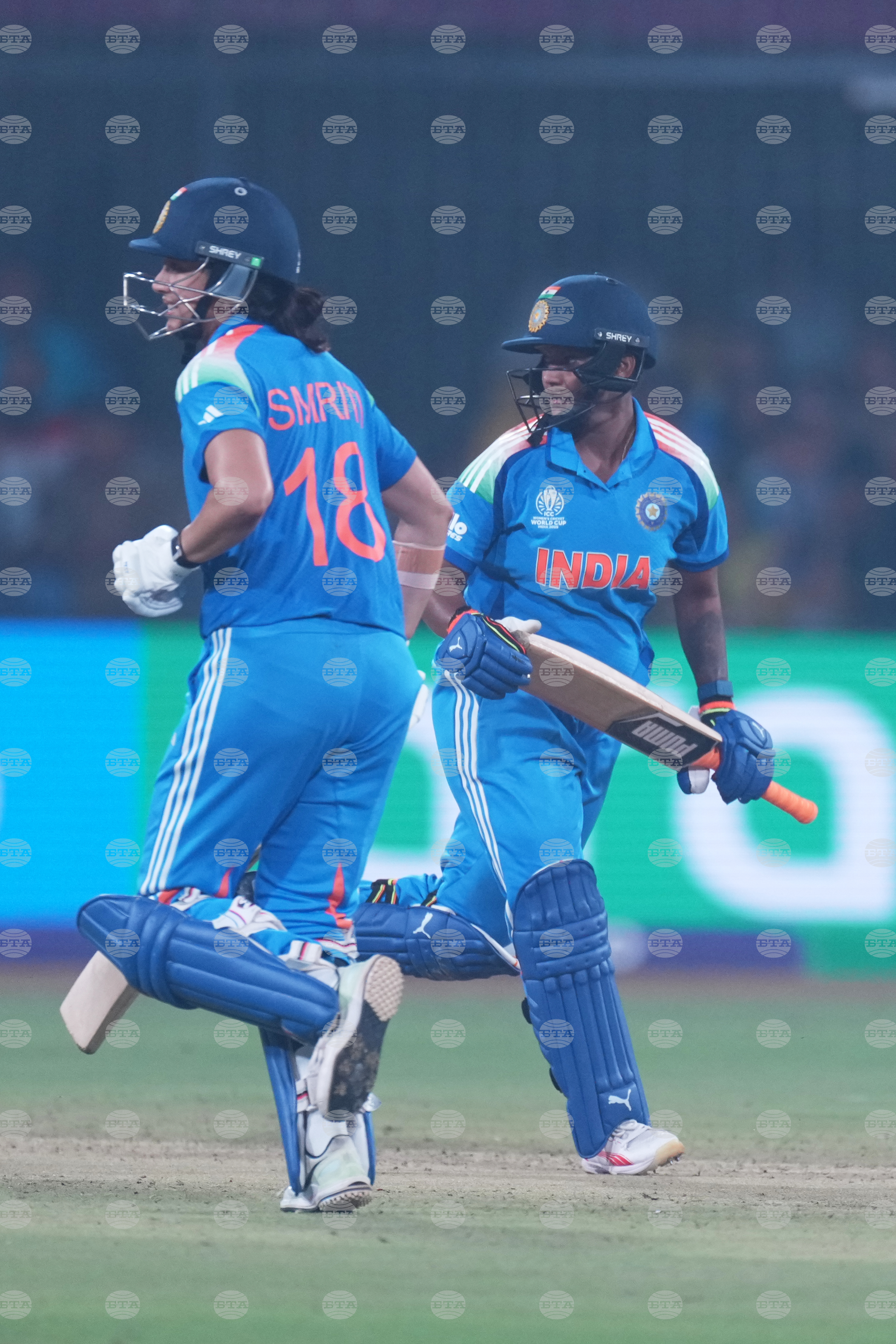 India's captain Harmanpreet Kaur, right, and Smriti Mandhana run between the wickets during the ICC Women's Cricket World Cup match between India and England in Indore, India, Sunday, Oct. 19, 2025. (AP Photo/Ajit Solanki)