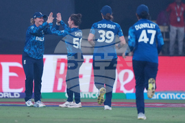 England's Linsey Smith, second left, celebrates with teammate the wicket of India's Smriti Mandhana during the ICC Women's Cricket World Cup match between India and England in Indore, India, Sunday, Oct. 19, 2025. (AP Photo/Ajit Solanki)