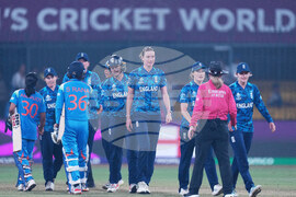 India's players shake hands with England's players after England won the match during the ICC Women's Cricket World Cup match between India and England in Indore, India, Sunday, Oct. 19, 2025. (AP Photo/Ajit Solanki)