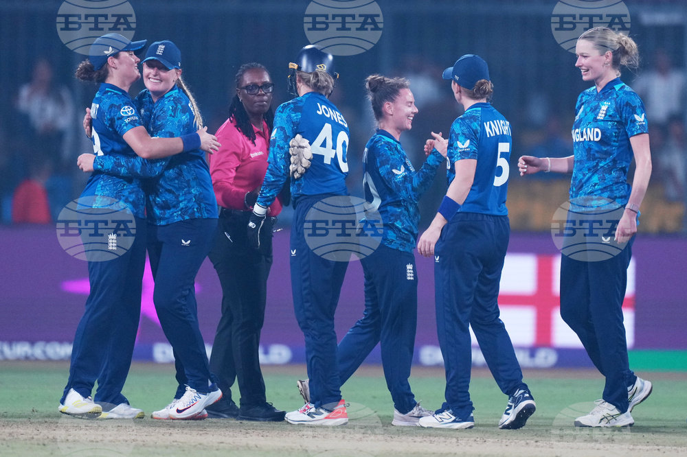 England's Sophie Ecclestone, second right, celebrates with teammate the wicket of India's Deepti Sharma during the ICC Women's Cricket World Cup match between India and England in Indore, India, Sunday, Oct. 19, 2025. (AP Photo/Ajit Solanki)