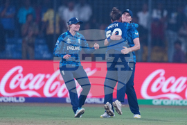 England's Linsey Smith, left, celebrates with teammate the wicket of India's Smriti Mandhana during the ICC Women's Cricket World Cup match between India and England in Indore, India, Sunday, Oct. 19, 2025. (AP Photo/Ajit Solanki)