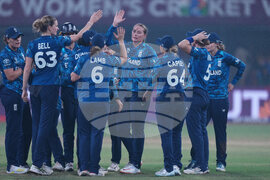 England's Lauren Bell, center, celebrates with teammate the wicket of India's Pratika Rawal during the ICC Women's Cricket World Cup match between India and England in Indore, India, Sunday, Oct. 19, 2025. (AP Photo/Ajit Solanki)