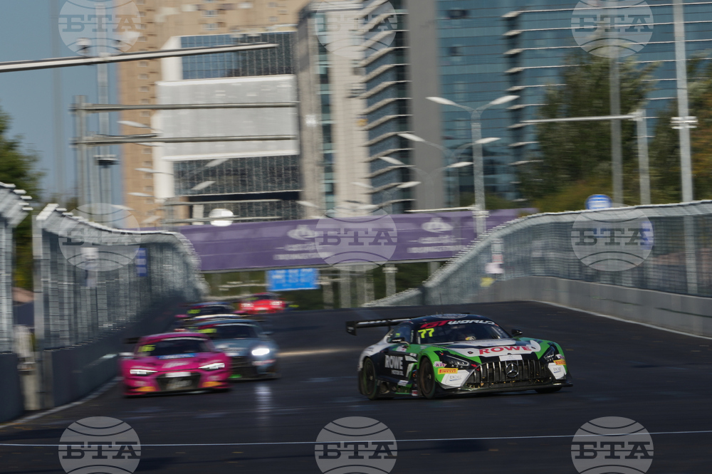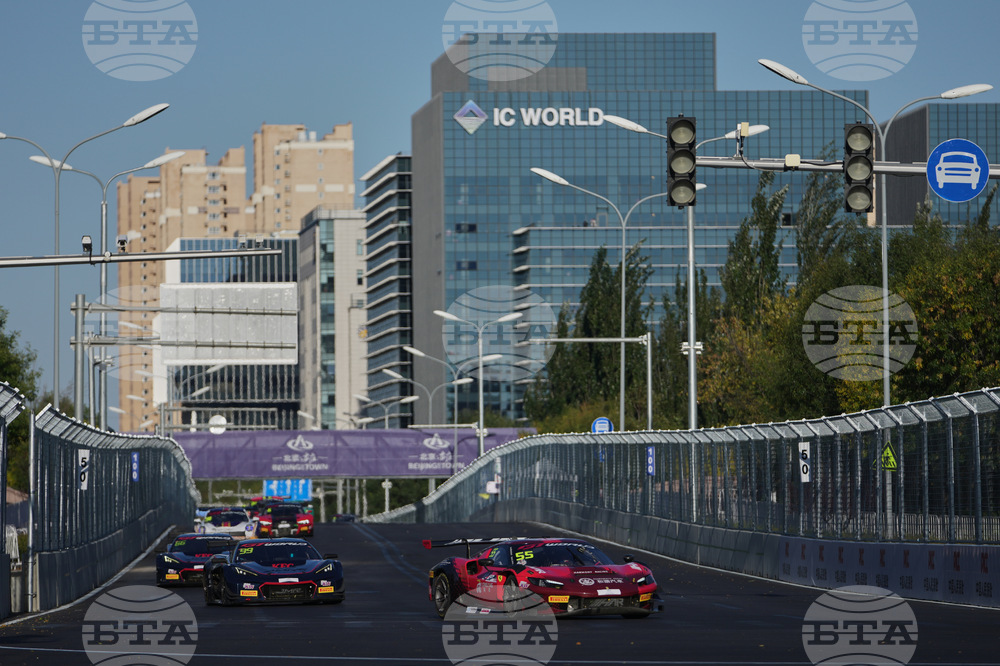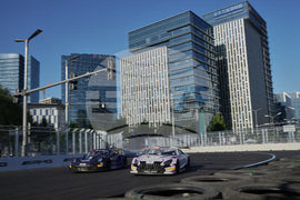 Drivers steer their cars on a street circuit during the GT World Challenge Asia Cup held at the Tongming Lake National Information Industry Park, in Beijing, Sunday, Oct. 19, 2025. (AP Photo/Andy Wong)