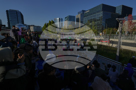 Spectators watch as drivers steer their cars during the GT World Challenge Asia Cup held on street circuit at the Tongming Lake National Information Industry Park, in Beijing, Sunday, Oct. 19, 2025. (AP Photo/Andy Wong)