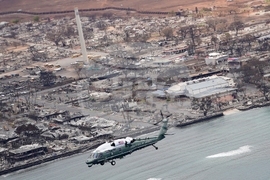 FILE - President Joe Biden and first lady Jill Biden take an aerial tour on Marine One over areas devastated by the Maui wildfires, Aug. 21, 2023, in Lahaina, Hawaii. (AP Photo/Evan Vucci, File)