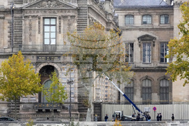 Police officers work by a basket lift used by thieves Sunday, Oct. 19, 2025 at the Louvre museum in Paris. (AP Photo/Thibault Camus)