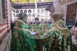Рилски манастир (19 октомври 2025) Рилският манастир отбелязва днес храмовия си празник Отчовден. Това е деня на пренасянето на мощите на основателя на манастира Св.Йоан Рилски от обителта в град Средец. Днешната служба по повод храмовият празник беше възглавена от митрополитът на САЩ, Канада и Австралия Йосиф (на снимката).