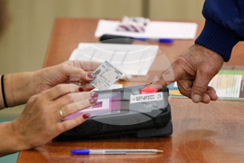 A man places his finger on a biometric scanner to prove his identity prior voting for the local elections, at a polling station in Skopje, North Macedonia, on Sunday, Oct. 19, 2025. (AP Photo/Boris Grdanoski)