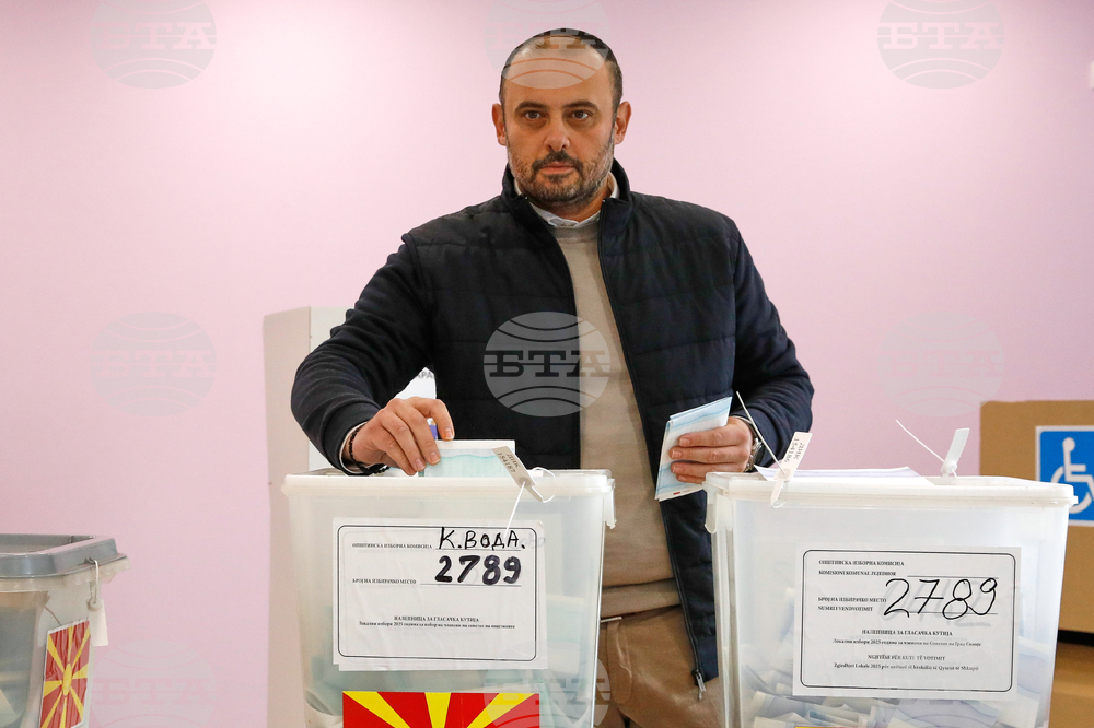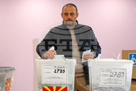 Orce Gjorgjievski, a candidate for a mayor of Skopje from the ruling conservative VMRO-DPMNE party, casts his ballots in the first round of the local elections, at a polling station in Skopje, North Macedonia, on Sunday, Oct. 19, 2025. (AP Photo/Boris Grdanoski)