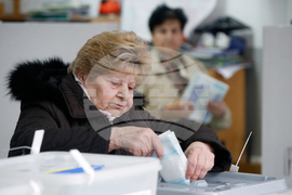 A woman casts her ballot for the local elections, at a polling station in Skopje, North Macedonia, on Sunday, Oct. 19, 2025. (AP Photo/Boris Grdanoski)