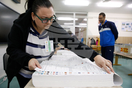 A member of the electoral commission prepares ballots during local elections, at a polling station in Skopje, North Macedonia, on Sunday, Oct. 19, 2025. (AP Photo/Boris Grdanoski)