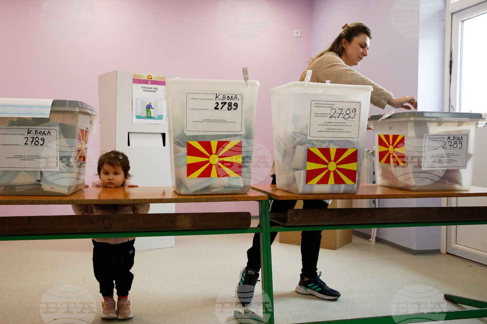 A little girl looks on as a woman casts her ballot for the local elections, at a polling station in Skopje, North Macedonia, on Sunday, Oct. 19, 2025. (AP Photo/Boris Grdanoski)