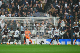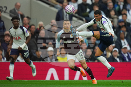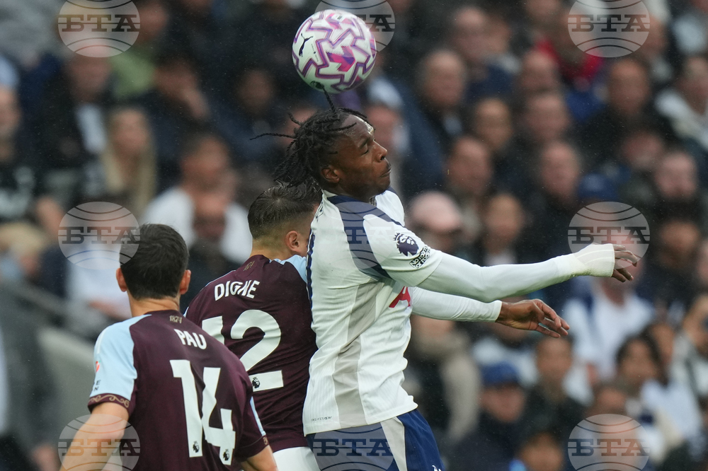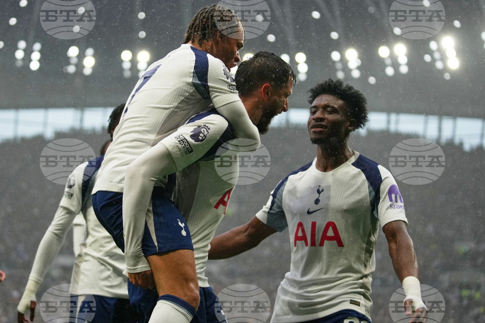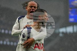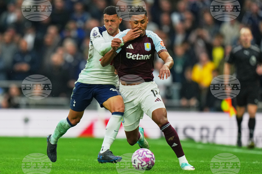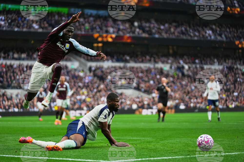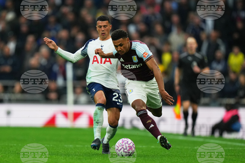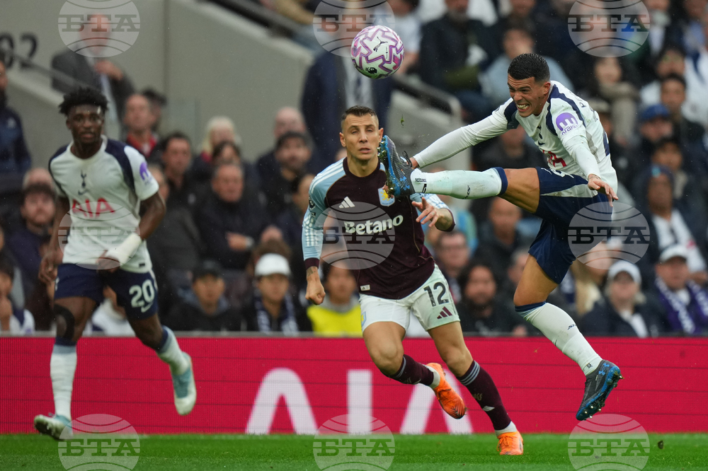 during the English Premier League soccer match between Tottenham Hotspur and Aston Villa in London, Sunday, Oct. 19, 2025. (AP Photo/Joanna Chan)