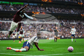 Tottenham's Wilson Odobert, left, defends the ball from Aston Villa's Matty Cash during the English Premier League soccer match between Tottenham Hotspur and Aston Villa in London, Sunday, Oct. 19, 2025. (AP Photo/Joanna Chan)