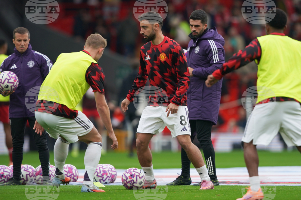 Manchester United's Bruno Fernandes, centre, warms up prior to the English Premier League soccer match between Liverpool and Manchester United in Liverpool, England, Sunday, Oct. 19, 2025. (AP Photo/Ian Hodgson)