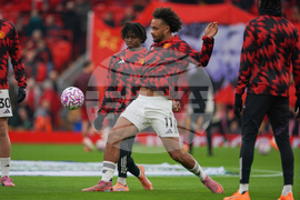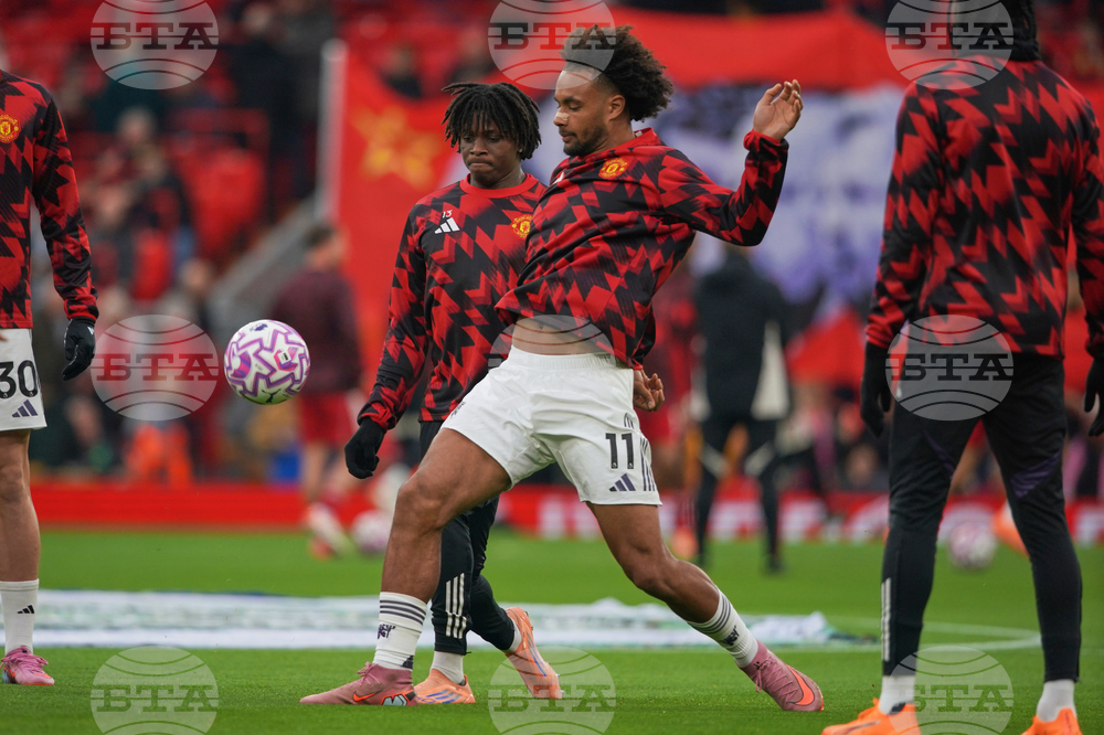 Manchester United's Joshua Zirkzee, centre, and Manchester United's Patrick Dorgu warm up prior to the English Premier League soccer match between Liverpool and Manchester United in Liverpool, England, Sunday, Oct. 19, 2025. (AP Photo/Ian Hodgson)