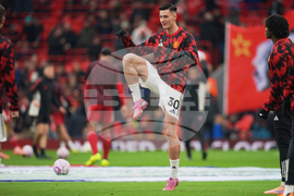 Manchester United's Benjamin Sesko warms up prior to the English Premier League soccer match between Liverpool and Manchester United in Liverpool, England, Sunday, Oct. 19, 2025. (AP Photo/Ian Hodgson)