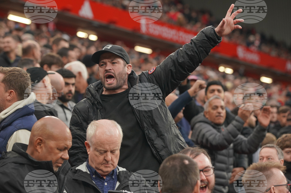 Manchester United fans cheer their team prior to the English Premier League soccer match between Liverpool and Manchester United in Liverpool, England, Sunday, Oct. 19, 2025. (AP Photo/Ian Hodgson)