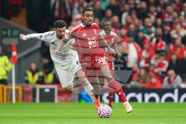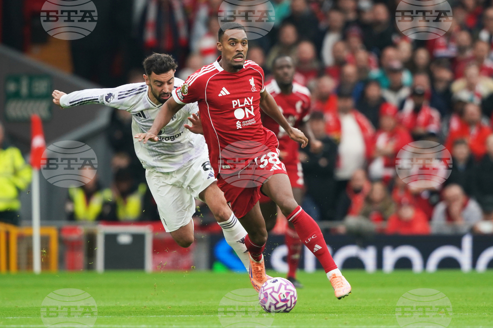 Manchester United's Bruno Fernandes, left, challenges for the ball with Liverpool's Ryan Gravenberch during the English Premier League soccer match between Liverpool and Manchester United in Liverpool, England, Sunday, Oct. 19, 2025. (AP Photo/Ian Hodgson)