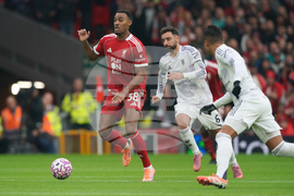 Manchester United's Bruno Fernandes, center, challenges for the ball with Liverpool's Ryan Gravenberch during the English Premier League soccer match between Liverpool and Manchester United in Liverpool, England, Sunday, Oct. 19, 2025. (AP Photo/Ian Hodgson)