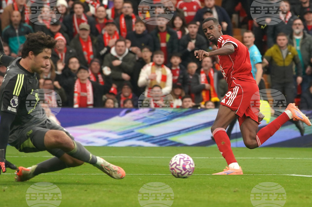 Liverpool's Alexander Isak, left, challenges for the ball with Manchester United's Bruno Fernandes during the English Premier League soccer match between Liverpool and Manchester United in Liverpool, England, Sunday, Oct. 19, 2025. (AP Photo/Ian Hodgson)