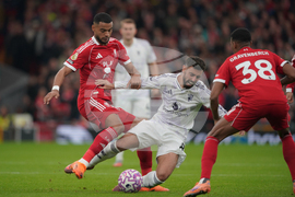 Liverpool's Cody Gakpo, left, challenges for the ball with Manchester United's Bruno Fernandes during the English Premier League soccer match between Liverpool and Manchester United in Liverpool, England, Sunday, Oct. 19, 2025. (AP Photo/Ian Hodgson)