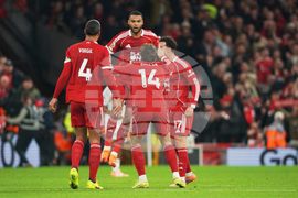Liverpool players celebrate after Liverpool's Cody Gakpo scored his side's opening goal during the English Premier League soccer match between Liverpool and Manchester United in Liverpool, England, Sunday, Oct. 19, 2025. (AP Photo/Ian Hodgson)