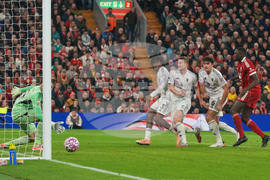 Manchester United's Harry Maguire, second right, scores his side's second goal during the English Premier League soccer match between Liverpool and Manchester United in Liverpool, England, Sunday, Oct. 19, 2025. (AP Photo/Ian Hodgson)