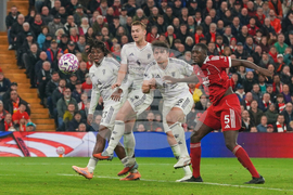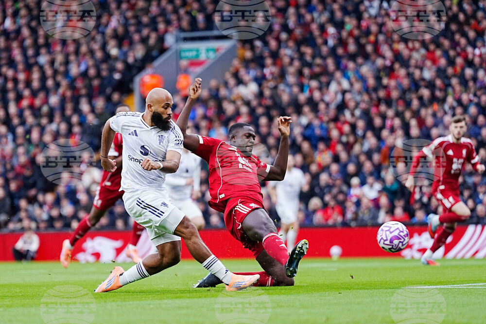 Liverpool's Milos Kerkez, left, challenges for the ball with Manchester United's Matthijs de Ligt during the English Premier League soccer match between Liverpool and Manchester United in Liverpool, England, Sunday, Oct. 19, 2025. (AP Photo/Ian Hodgson)