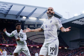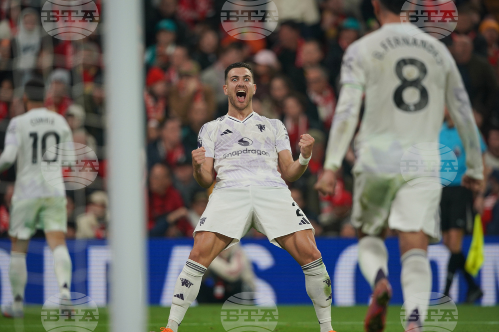 Manchester United's Diogo Dalot celebrates after Manchester United's Harry Maguire scored during the English Premier League soccer match between Liverpool and Manchester United in Liverpool, England, Sunday, Oct. 19, 2025. (AP Photo/Ian Hodgson)