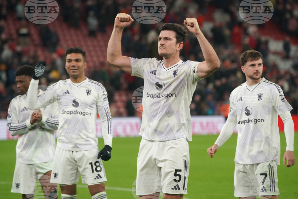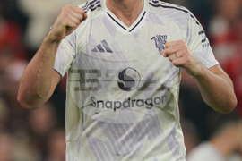 Manchester United's Harry Maguire celebrates after scoring his side's second goal during the English Premier League soccer match between Liverpool and Manchester United in Liverpool, England, Sunday, Oct. 19, 2025. (AP Photo/Ian Hodgson)