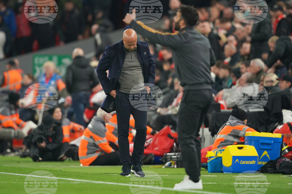 Liverpool's manager Arne Slot, centre, reacts during the English Premier League soccer match between Liverpool and Manchester United in Liverpool, England, Sunday, Oct. 19, 2025. (AP Photo/Ian Hodgson)