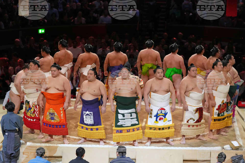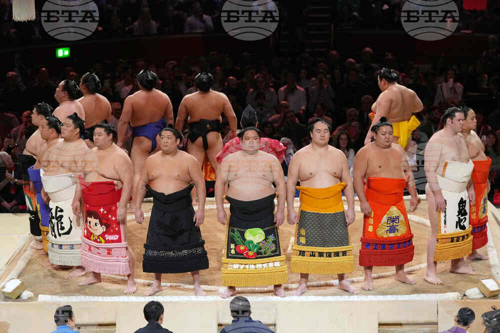 Sumo rikishi during the opening ceremony ahead of the Grand Sumo Tournament on the dohyo, the sacred sumo wrestling ring, at the Royal Albert Hall in London, Sunday, Oct. 19, 2025.(AP Photo/Frank Augstein)