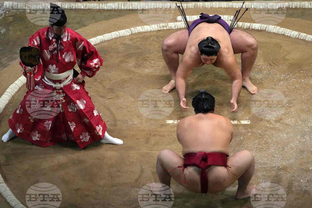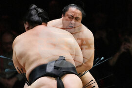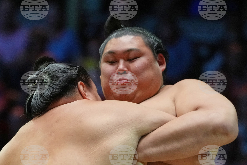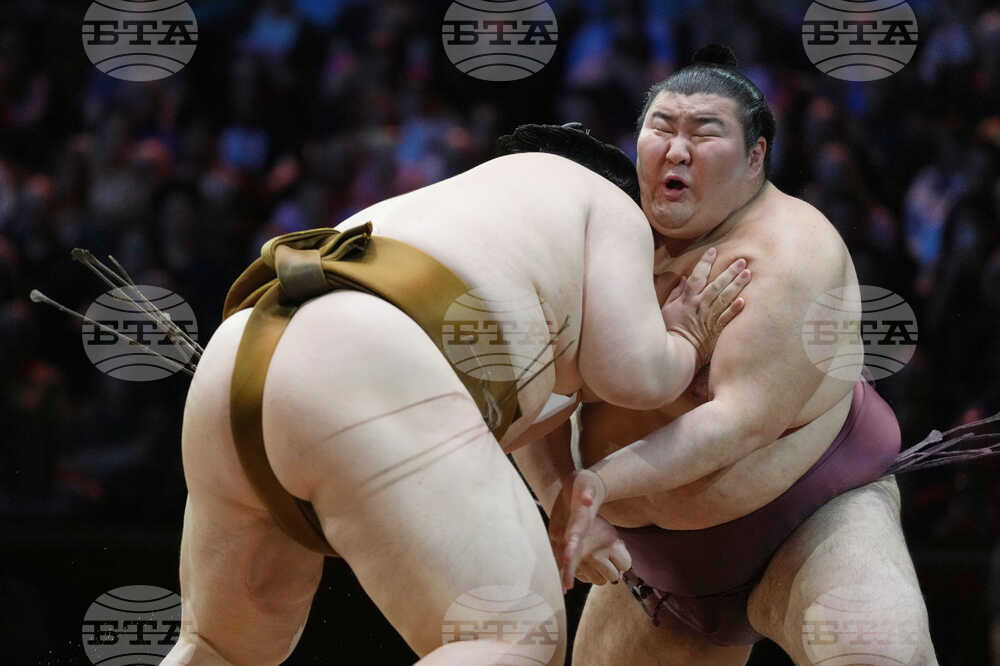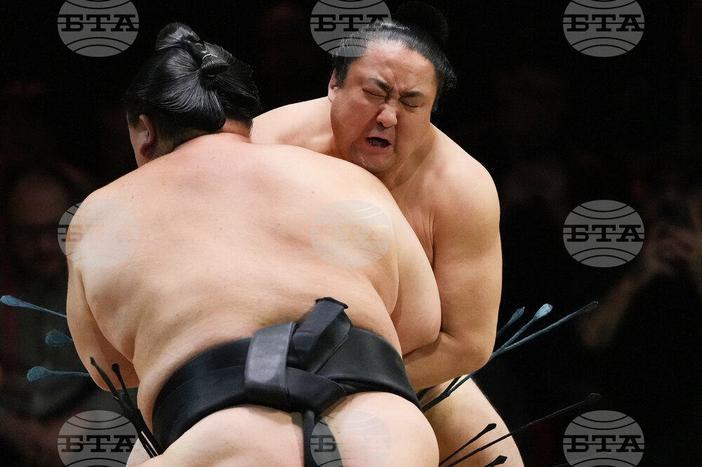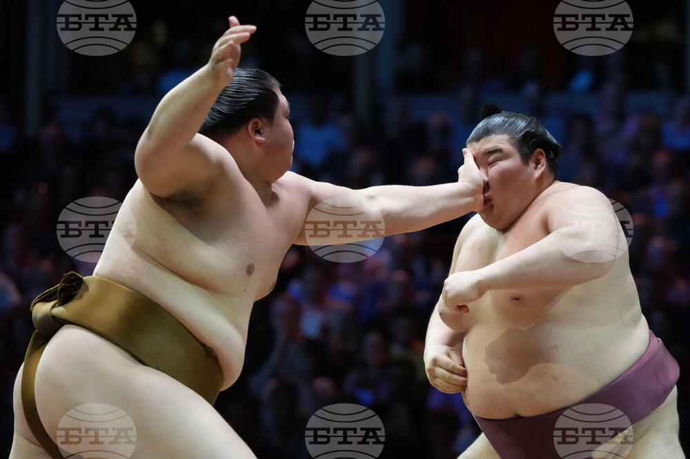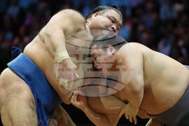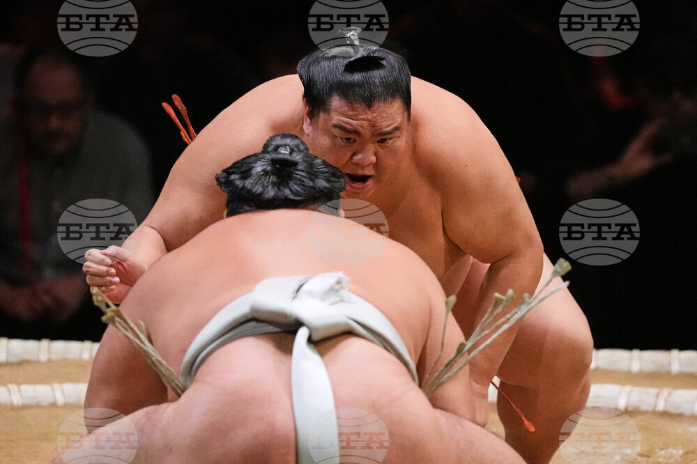 Sumo rikishi Mitakeumi, facing, and Hitoshi during their Grand Sumo Tournament bout on the dohyo, the sacred sumo wrestling ring, at the Royal Albert Hall in London, Sunday, Oct. 19, 2025.(AP Photo/Frank Augstein)