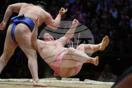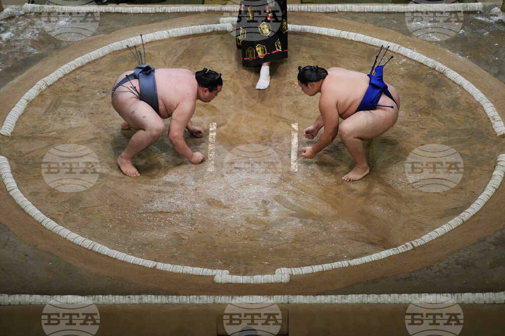 Sumo rikishi Shodai and Sadanoumi during their Grand Sumo Tournament bout on the dohyo, the sacred sumo wrestling ring, at the Royal Albert Hall in London, Sunday, Oct. 19, 2025.(AP Photo/Frank Augstein)