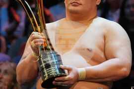 Sumo rikishi Hoshoryu holds the Grand Champion trophy after winning the Grand Sumo Tournament at the Royal Albert Hall in London, Sunday, Oct. 19, 2025.(AP Photo/Frank Augstein)