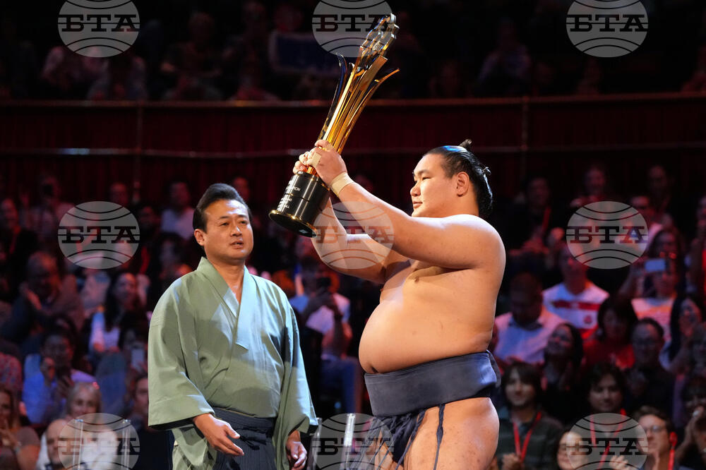 Sumo rikishi Hoshoryu, left, is presented with a toy after winning the Grand Sumo Tournament at the Royal Albert Hall in London, Sunday, Oct. 19, 2025.(AP Photo/Frank Augstein)