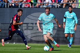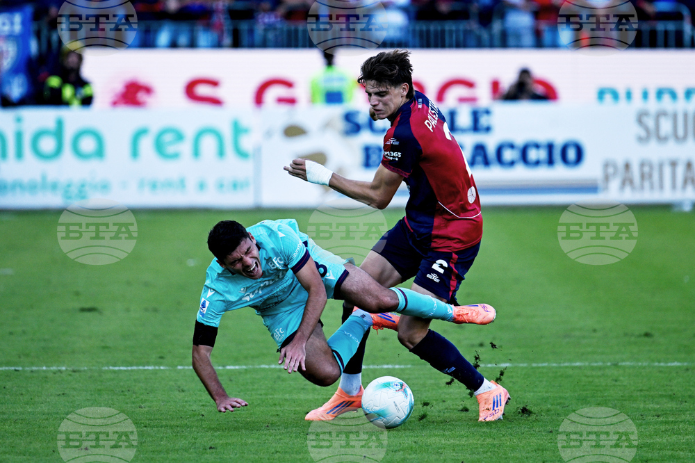 Cagliari's Marco Palestra, right, vies for the ball, during the Serie A soccer match between Cagliari Calcio and Bologna, in Cagliari, Italy, Sunday, Oct. 19, 2025. (Gianluca Zuddas/LaPresse via AP)