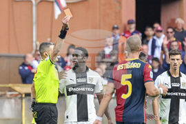 Parma's Abdoulaye Ndiaye, second left, is shown a red card during the Serie A soccer match between Genoa and Parma in Genoa, Italy, Sunday Oct. 19, 2025. (Tano Pecoraro/LaPresse via AP)