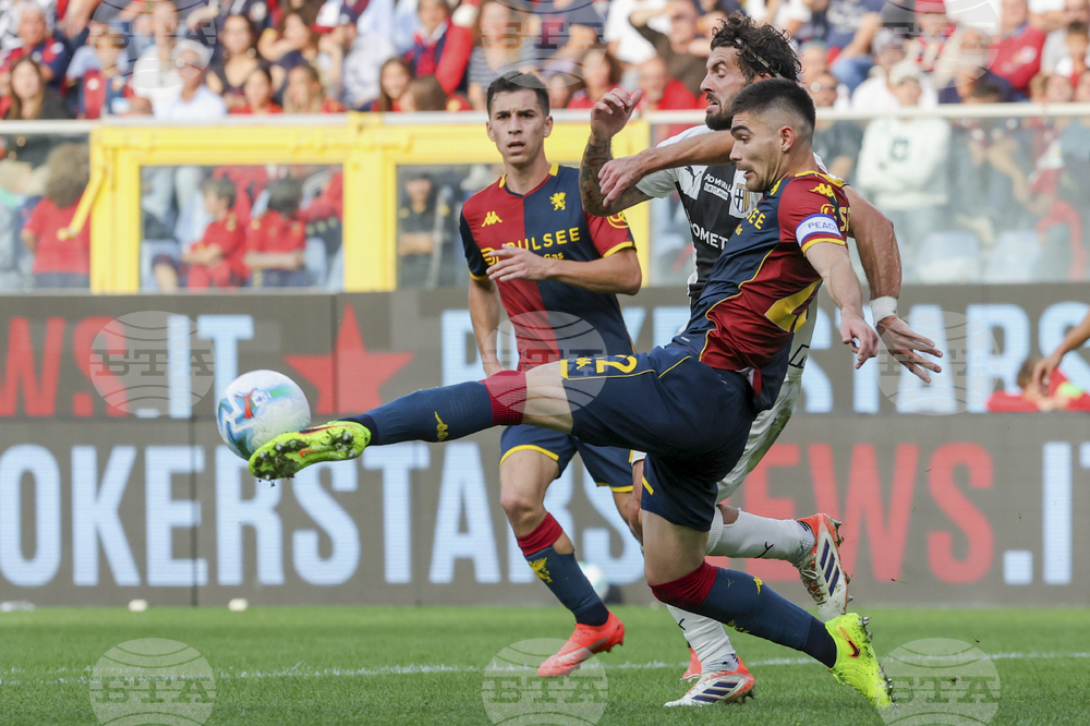 Genoa's Lorenzo Venturino, left, and Parma's Enrico Del Prato in action during the Serie A soccer match between Genoa and Parma in Genoa, Italy, Sunday Oct. 19, 2025. (Tano Pecoraro/LaPresse via AP)
