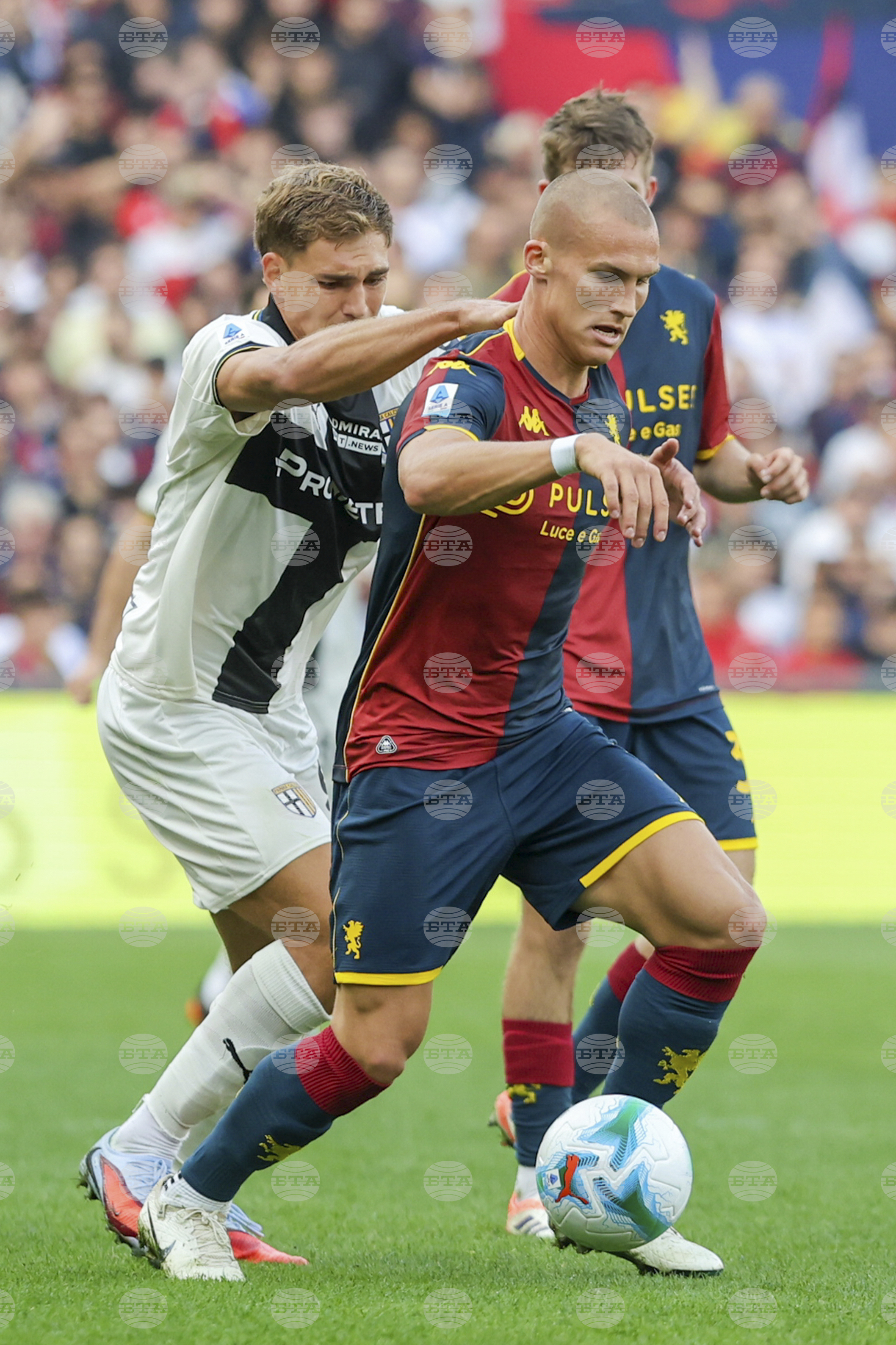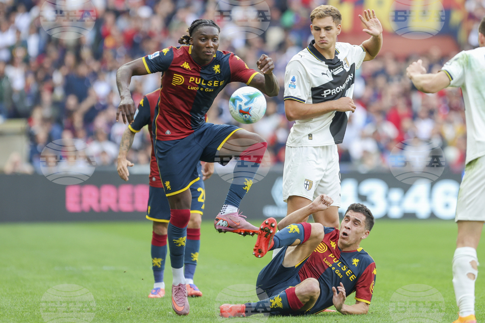 Genoa's Caleb Ekuban and Parma's Alessandro Circati, left, in action during the Serie A soccer match between Genoa and Parma in Genoa, Italy, Sunday Oct. 19, 2025. (Tano Pecoraro/LaPresse via AP)