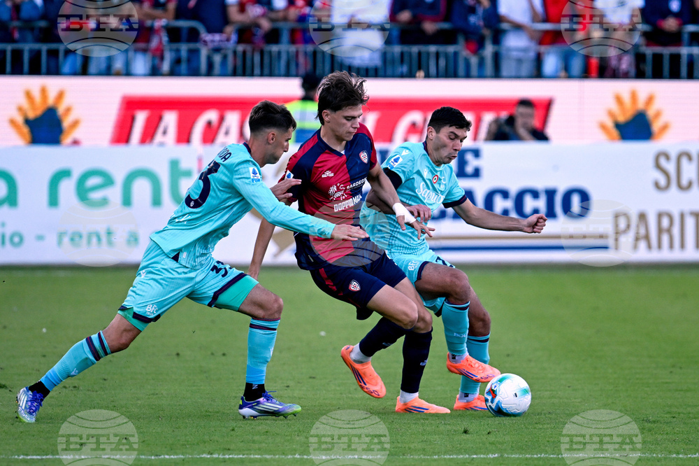 Cagliari's Marco Palestra, center, controls a ball, during the Serie A soccer match between Cagliari Calcio and Bologna, in Cagliari, Italy, Sunday, Oct. 19, 2025. (Gianluca Zuddas/LaPresse via AP)