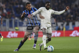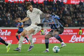Atalanta's Kamaldeen, foreground right, vies for the ball with Sulemana Lazio's Mario Gila during the Serie A soccer match between Atalanta B.C. and S.S. Lazio in Bergamo, Italy, Sunday Oct. 19, 2025. (Stefano Nicoli/LaPresse via AP)