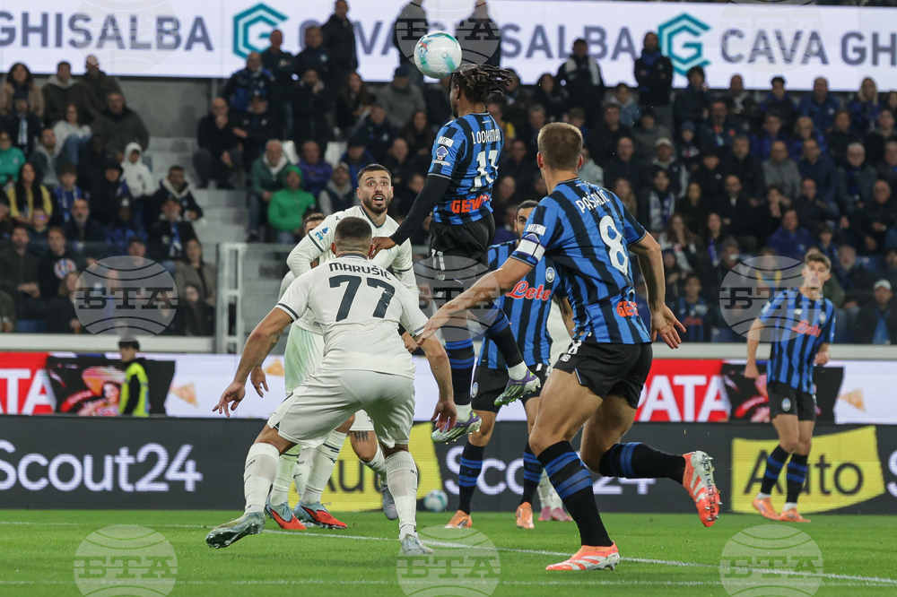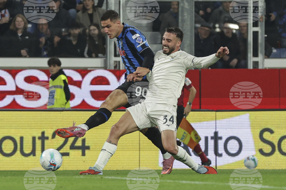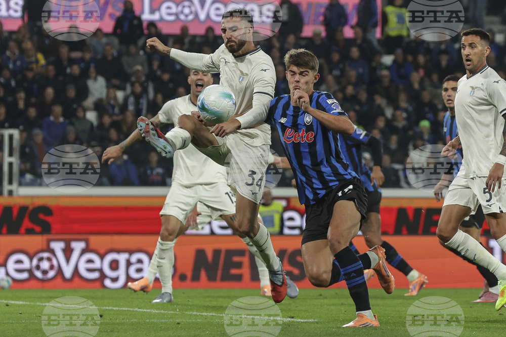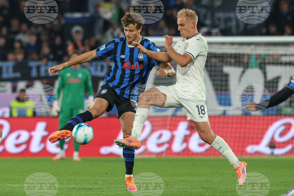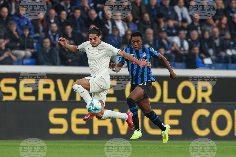 Lazio's Toma Basic, background center, vies for the ball with Atalanta's Ederson during the Serie A soccer match between Atalanta B.C. and S.S. Lazio in Bergamo, Italy, Sunday Oct. 19, 2025. (Stefano Nicoli/LaPresse via AP)