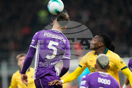 Fiorentina's Marin Pongracic, top, heads the ball past AC Milan's Rafael Leao during a Serie A soccer match between AC Milan and Fiorentina, in Milan, Italy, Sunday, Oct. 19, 2025. (AP Photo/Luca Bruno)